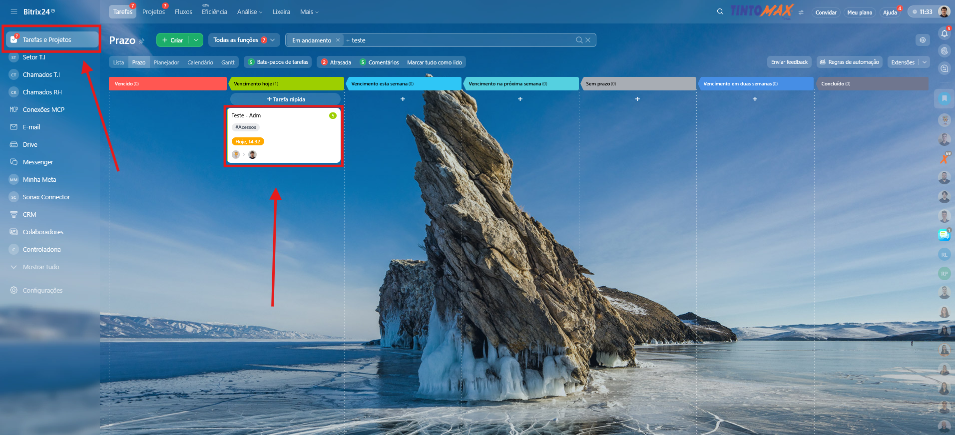 Como mostrado na imagem acima, você terá que acessar ( TAREFAS E PROJETOS ) , que se localiza no canto superior esquerdo. E após isso tentar procurar pelo chamado que você abriu, o chamado terá o mesmo nome que você adicionou no campo ( O QUE OCORREU ? ).
